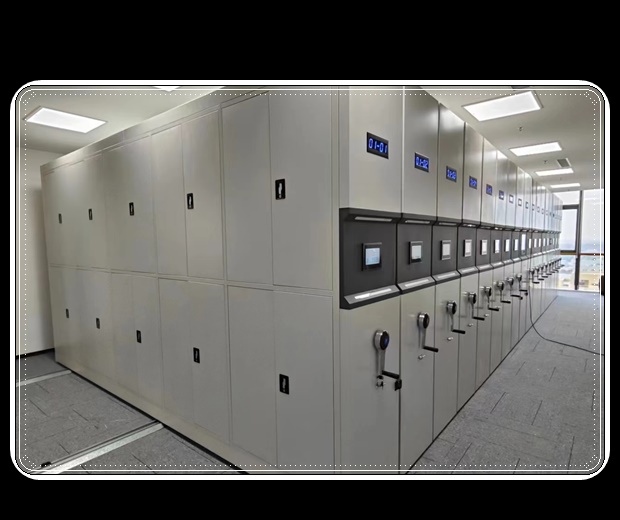 檔案資料庫智能密集柜具有載量多,使用方便等特點,主要用于檔案資料、證券憑證等的存放。主要由軌道、柜體、底盤、面板、門板、目錄卡及傳動裝置、防倒裝置、密封裝置九部分組成: